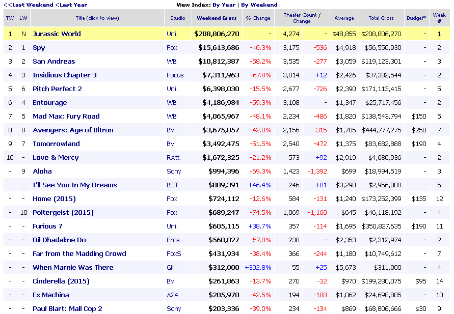 ตอนนี้ตัวเลขจริงออกมาแล้วครับ ปรากฎว่ารายได้เปิดตัวของ JURASSIC WORLD เพิ่มขึ้นจากรายได้คาดการณ์ก่อนหน้า ทำลายทุกสถิติเปิดตัวสูงสุดตลอดกาลทั้งในอเมริกา ต่างประเทศ และรวมทั่วโลก ** BOX OFFICE SUMMARY *