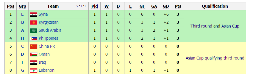 อัพเดทคะแนนล่าสุดกลุ่ม H 1.) เกาหลีใต้ 1 นัด 3 คะแนน (ได้เสีย +4) 2.) ไทย 1 นัด 3 คะแนน (ได้เสีย +3) 3.) ไทเป 2 นัด 3 คะแนน (ได้เสีย +7) 4.) สิงคโปร์ 2 นัด 3 คะแนน (ได้เสีย +6) 5.) หมู่เกาะมาเรียนนา 2