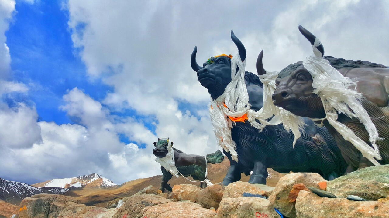 อนุสาวรีย์จามรีขนาดใหญ่ 3 ตัวตั้งตระง่านด้านหน้า นักท่องเที่ยวจำนวนมากลงพักลงไปถ่ายรูปที่จุดนี้ ทิวทัศน์สวยมากทีเดียวครับ และต้องบอกว่าด้วยความสูงขนาดนี้นอกจากออกซิเจนที่ค่อนข้างน้อย อุณหภูมิยังค่อนข้างต่ำและลมแรงอีกด้วยครับ