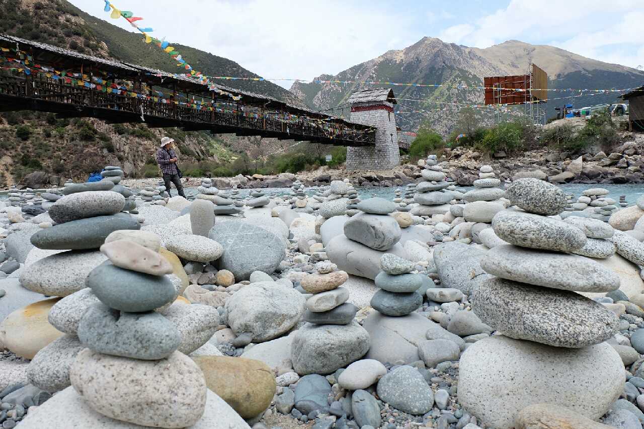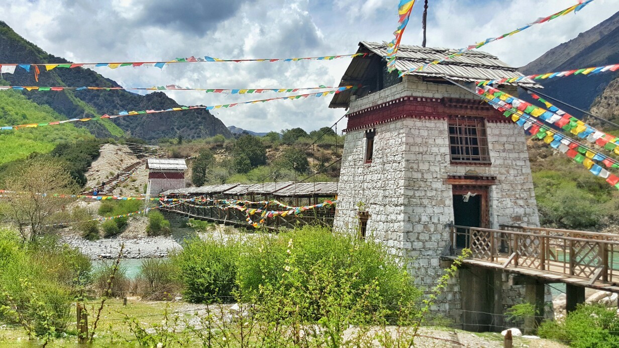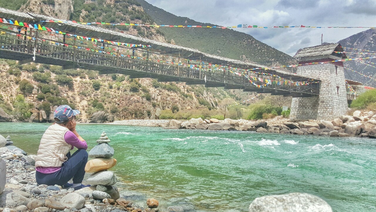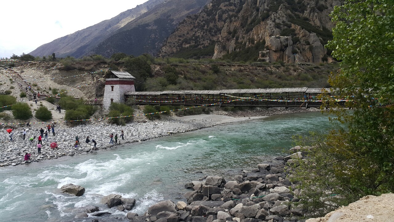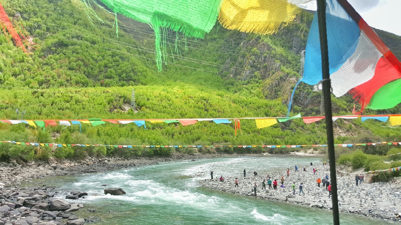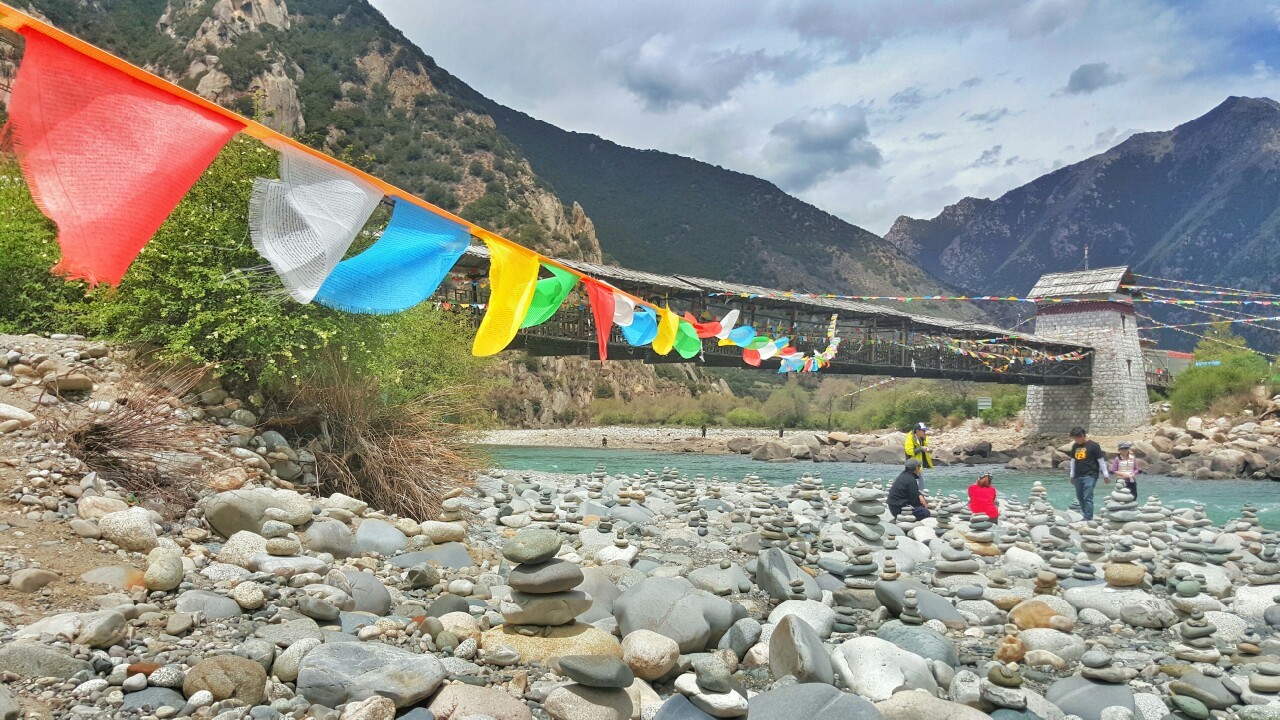 จุดพักจุดต่อไปสำหรับผมในวันนี้ถือว่าน่าสนใจทีเดียวครับ เพราะบรรยาศรอบด้านสวยงามมากครับ นักท่องเที่ยวจำนวนไม่น้อยหยุดพักที่จุดนี้ สะพานข้ามแม่น้ำที่ถูกตกแต่งด้วยธงมนต์ตราหลากสี เราเสียค่าข้ามสะพานเพื่อไปอีกด้านหนึ่งคนละ 1 หยวน