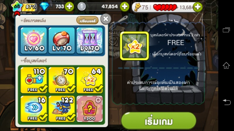 คุกกี้ภูตอัคคี + เพทหยดชีส | พอนเดอริง,ขนนก,จอยวิวัฒน์ บูสเตอร์ : ออกตัวเร็ว https://www.youtube.com/watch?v=U-zzimaLjqw เริ่มเกมด้วย"ออกตัวเร็ว" จะทำให้เราไม่เสียพลังในด่าน 1 และความสามา