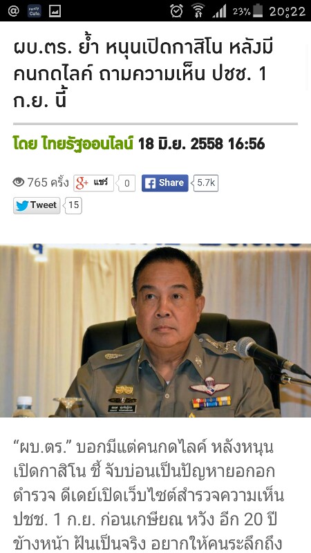 ผบ.ตร. ย้ำ หนุนเปิดกาสิโน หลังมีคนกดไลค์ ถามความเห็น ปชช. 1 ก.ย. นี้