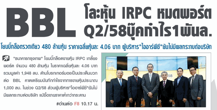 BBL ขายหุ้น IRPC เกลี้ยง กำไร 1 พันล้าน