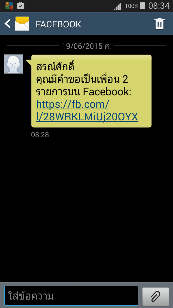 ได้รับข้อความ ทางโทรศัพท์ว่า มีคำร้องขอเป็นเพื่อน แต่ส่ง smsมาทางมือถือ ผมเข้าเฟสไปเช็คดูก็ไม่มีคำร้องขึ้นมา อย่างนี้คืออะไรครับ ผมไม่ได้กดลิงค์ตามข้อความครับ กลัวมิจฉาชีพ