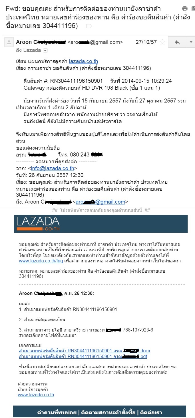 รากนั้นผมก้อโทรแจ้งทางLAZADAทันทีเค้ากัอบอกว่าให้ส่งสินค้ากลับคืนมา ผมก้อบอกว่าผมไม่สามารถเดินไปคืนได้เพราะผมเป็นคนพิการไม่สามารถเดินได้ เค้าก้อบอกว่าเดี๋ยวแจ้งให้คลังสินค้ามารับคืน ผมรอมาสามวันก้อไม่เห็นจะมีใครโทรมาแจ้งอะไรเลยจนถึงวันนี้