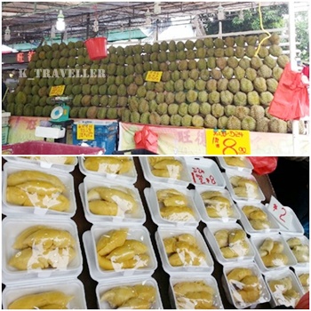 เต็มอิ่มกับติ่มซำก็เดินไปขึ้น mrt ที่สถานี Aljunied ที่เดิม ข้างทางจะมีร้านผลไม้อยู่หลายร้าน แต่ทีสะดุดตาคือ ร้านขายทุเรียน ซึ่งคนที่นี่เขาจะกินทุเรียนชนิดที่เรียกว่า เละแบบใกล้จะเน่าแล้วก็ว่าได้ เพราะกลิ่นมันอภิมหึมามหาเหม็นตึ้บกันไป 5 ซอย 10 ซอย กันเลย เล่นเอาคนไม่กินทุเรียนอย่างเราเวียนหัวแทบจะอ้วกซะให้ได้ ลูกไหนที่ไม่เละ คนขายก็จะเอาทุ่มลงที่พื้นปูนหลายๆ ครั้ง ก่อนจะแกะให้ลูกค้า ส่วนลูกค้า ก่อนจะซื้อก็จะหยิบขึ้นมาดมจนเป็นที่พอใจก่อนค่อยยื่นให้พ่อค้าแกะให้ และไม่รู้ว่าคนที่นี่ไม่นิยมหมอนทองหรืออย่างไรไม่ทราบ เพราะทุเรียนที่เขากินถ้าไม่ใช่พันธุ์ชะนีก็น่าจะเป็นพันธุ์กระดุม ซึ่งเป็นลูกเล็กๆ ขนาดใหญ่กว่ากำปั้นนิดเดียว