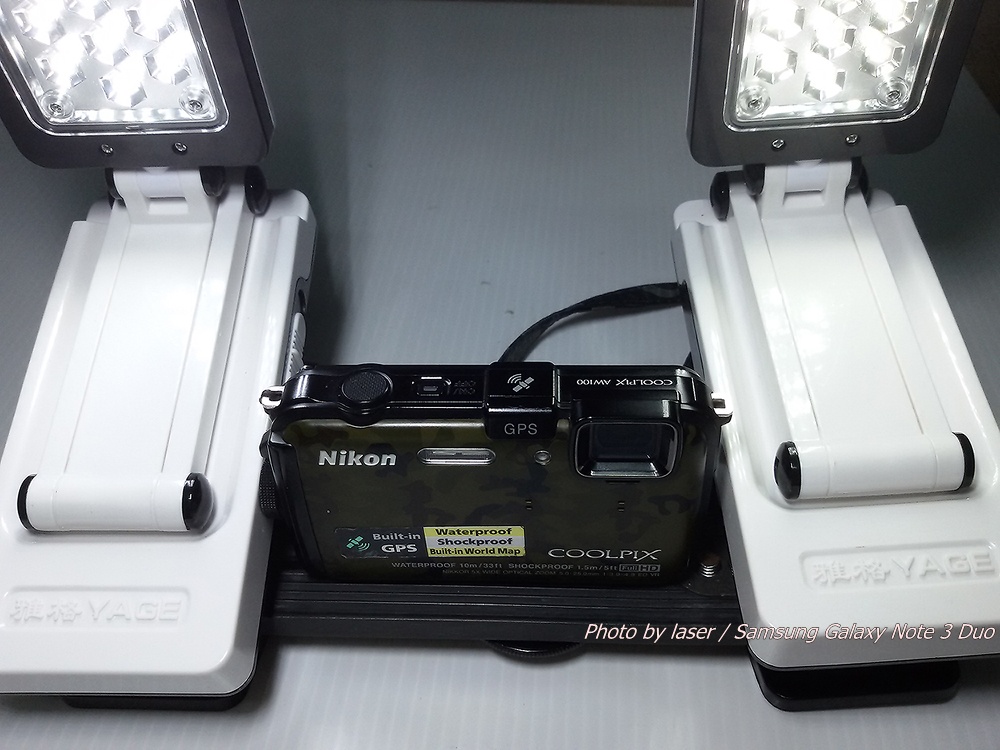 จึงดัดแปลงโดยใช้ขาแฟลชที่มีอยู่ เพื่อใช้เป็นฐานสำหรับหนีบไฟฉายแอลอีดี 2 ตัว
