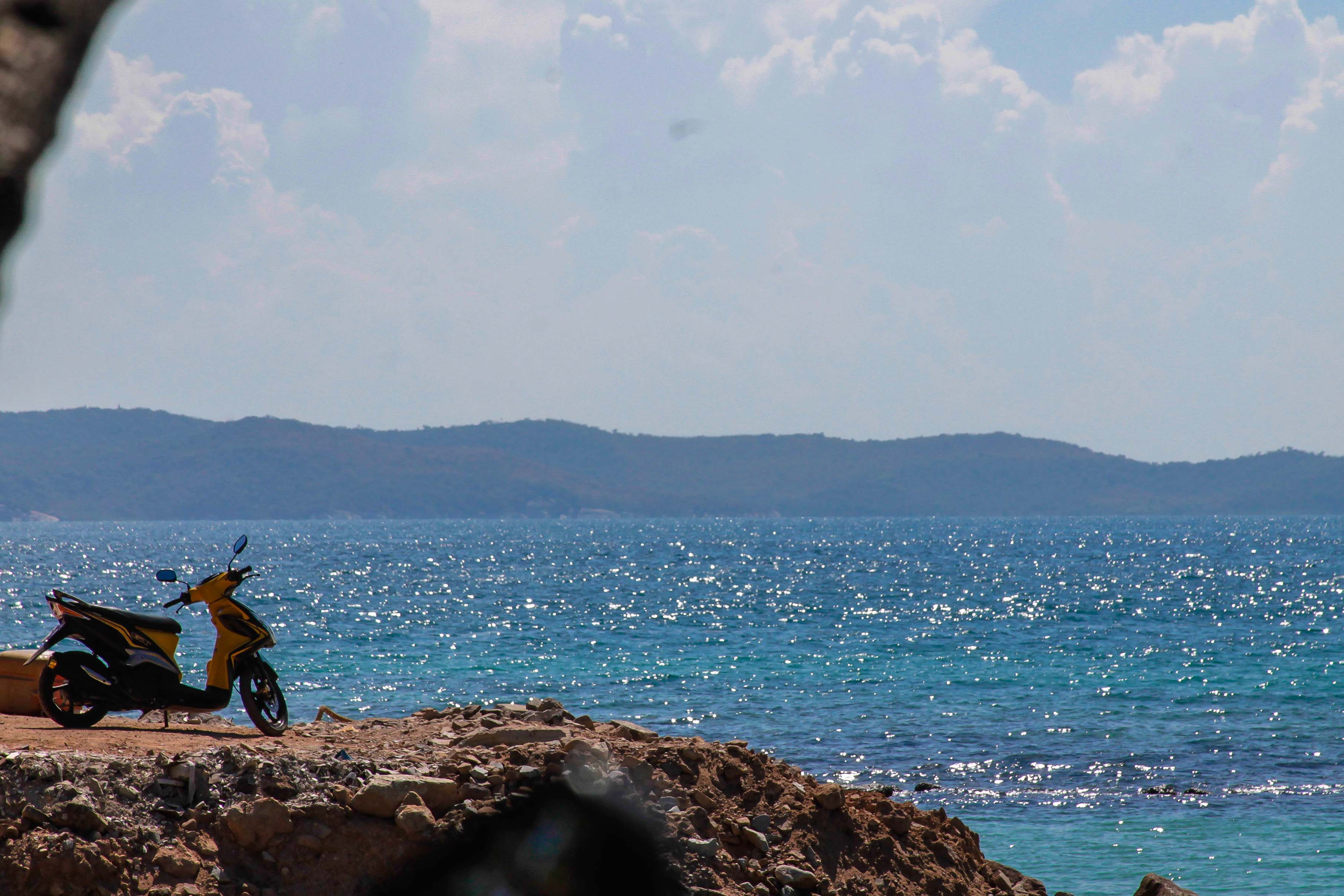 พอถึงท่าเรือหน้าบ้านก็ตรงไปเช่ามอไซค์ทั้นที (2คัน 5คน 600บาท วางบัตรประชาชน 1ใบ) แล้วจู่ๆ ก็มีตาลุงเดินมาถามว่ามีห้องพักยัง มากี่คน เราเลยบอกไป 5 คนครับ แกเลยถามต่อเอามั๊ย 2000 เพื่อนอีกคนเลยบอกว่าเดี๋ยวก่อนครับลุงขอตัดสินใจก่อน เพราะตอนนั้นหิวข้าวกันมาก ก็เลยขับรถไปทางหาดนวล ระหว่างทางเจอร้านอาหารวิวดีมาก ก็เลยแวะซะเลย รสชาติดี ราคาเทียบเท่าร้านเหล้า กินเสร็จก็ตกประมาณ คนล่ะ 200