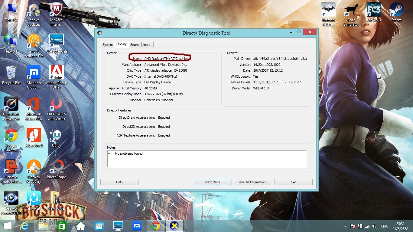 เเต่พอมาดูใน dxdiag กลายเป็นตัว AMD Raeon(tm) R7 ตามภาพ