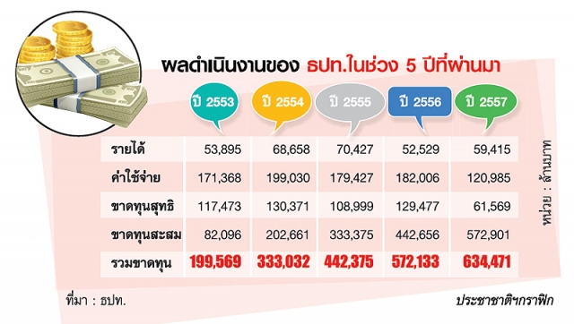 อย่างไรก็ตาม เป็นเรื่องน่าสนใจเมื่อดูงบดุล ธปท.ประจำงวดปี 2557 ที่เผยแพร่ออกมาล่าสุด พบว่า ธปท.ขาดทุนสุทธิประจำงวด 61,569 ล้านบาท ซึ่งต่ำสุดในรอบ 5 ปี แต่เมื่อรวมกับผลขาดทุนสะสมอีก 572,901 ล้านบาท ส่งผลให้ภาพรวมมีผลดำเนินงานขาดทุน 634,471 ล้านบาท ย้ำเตือนว่า "ธปท.ยังมีผลขาดทุนทางบัญชีต่อเนื่อง" แม้ปีที่ผ่านมา ธปท.ขาดทุนสุทธิลดลงและต่ำกว่าระดับ 1 แสนล้านบาท ก็ตาม