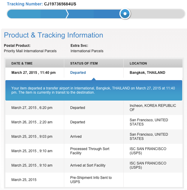 ด้วยการที่ใช้ Priority mail ของน่าจะถึงผู้รับภายใน 7 วัน ค่าบริการรวม tracking number และประกันไม่เกิน $100 แล้ว จขกท.ผู้ส่ง ส่งเสร็จก็หนีไปเที่ยวนอกประเทศ ไม่ได้เช็คของให้เพื่อน กลับมาดูอีกที ของไม่รู้ไปอยู่ไหนแล้วค่ะ