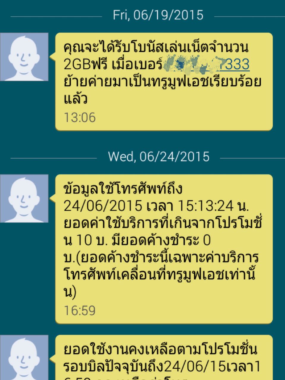 เลยโทรไปสอบถาม 1331 ได้รับคำตอบว่าเป็นการใช้งาน sms แต่ทางผมยืนยันได้ว่าไม่มีการส่ง sms แน่ๆ เลยเข้า iservice เช็คพบว่าวันที่ 19/6/2015 เวลา 13.06 มีการส่งไปเลขหมายเพื่อนผม 5 ครั้ง