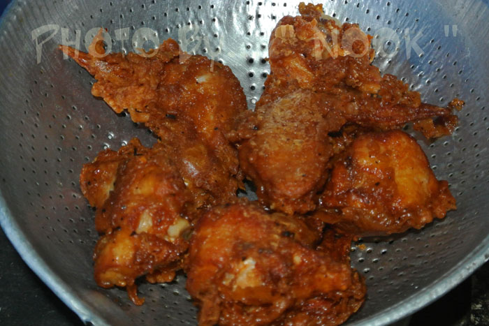 มีแค่เนื้อไก่ส่วนไหนก็ได้ แป้งทอดกรอบปรุงรส นำแป้งละลายกับน้ำเย็นนำไก่หมักไว้ ( ของเราหมักไว้ในตู้เย็น 1 คืน ) ก่อนนำมาทอด