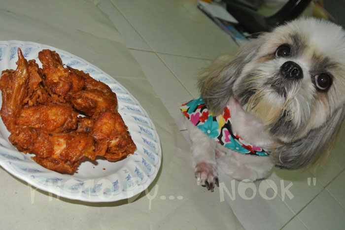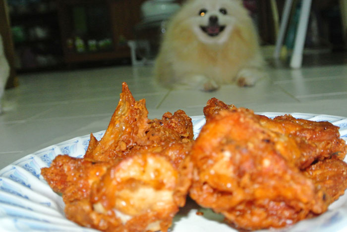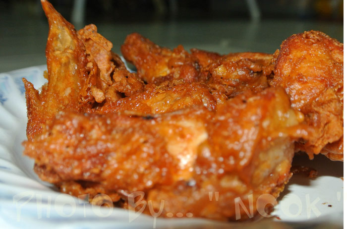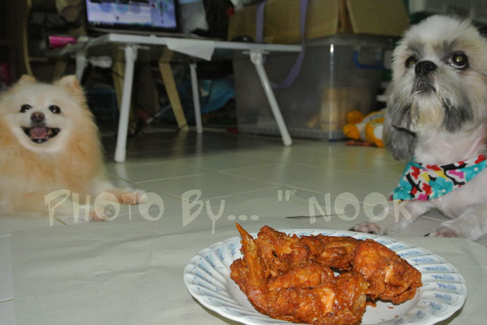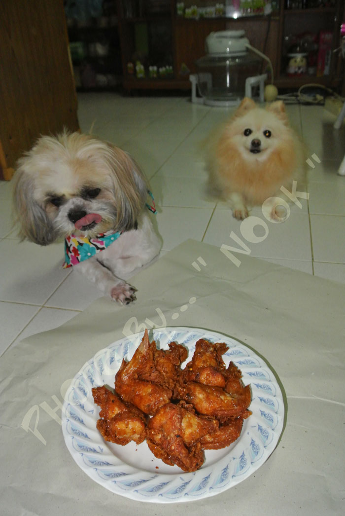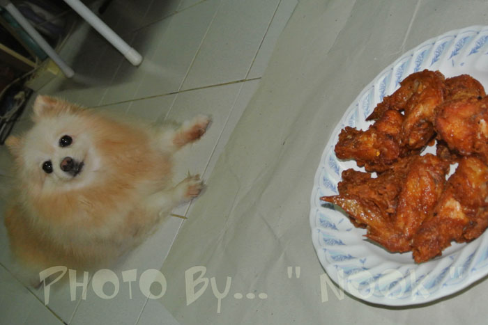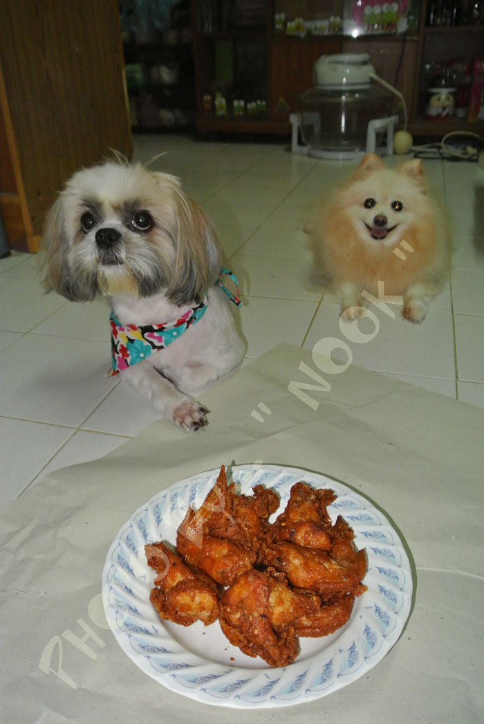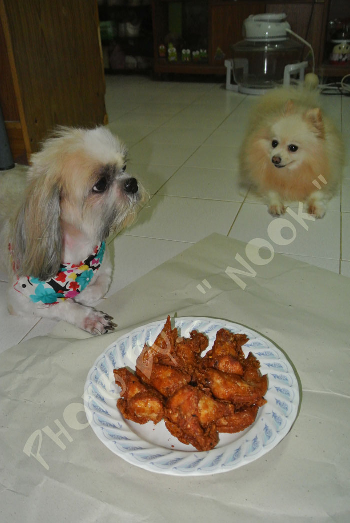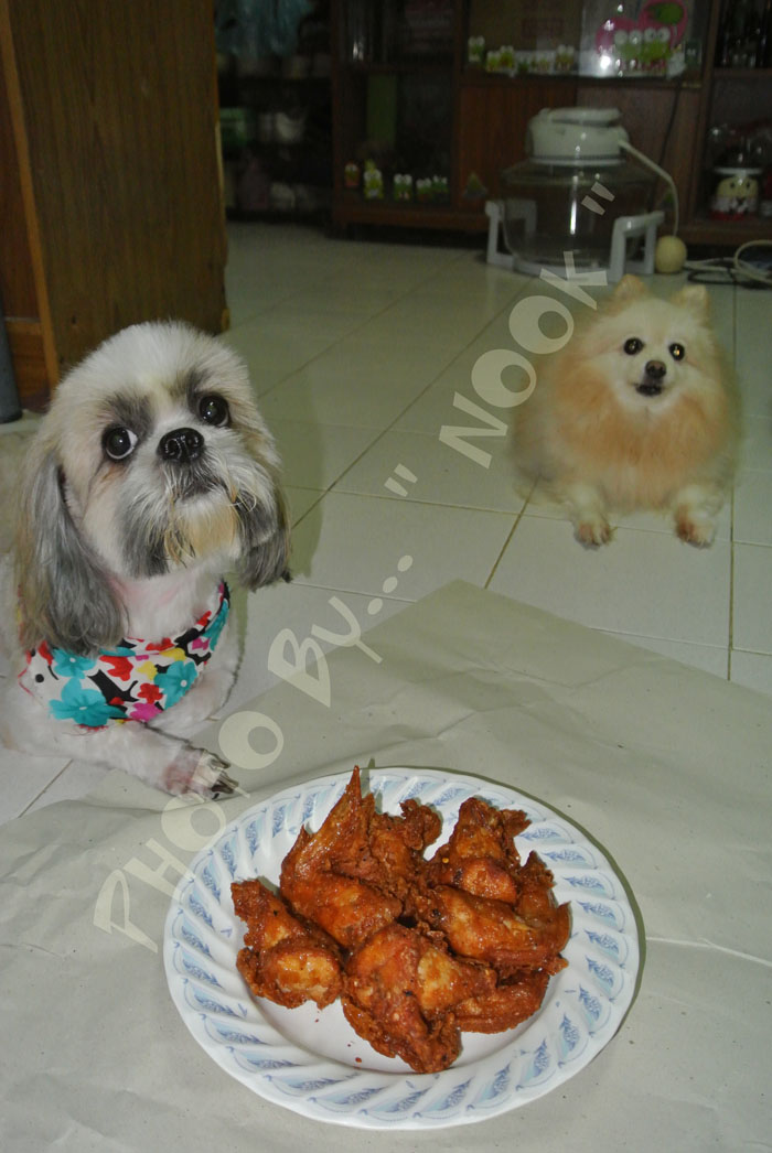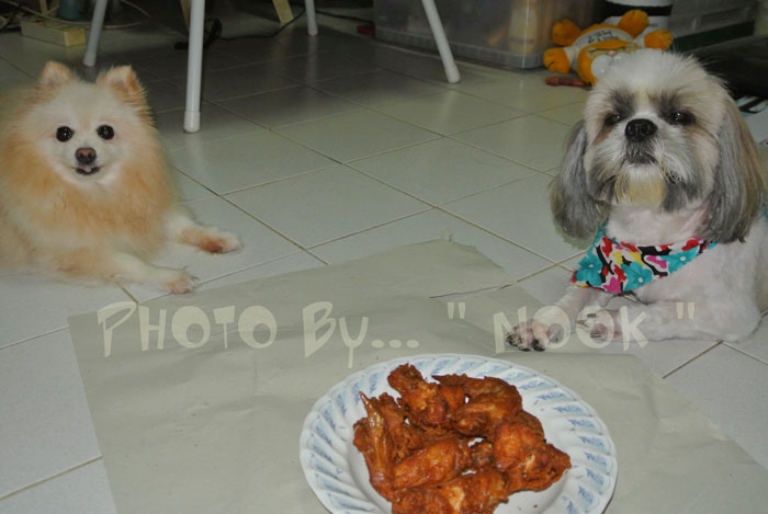 ระหว่างรอให้ไก่ทอดเย็น เราก็ไปอาบน้ำรอ โดยให้ 2 นางนั่งเฝ้าไก่ ( จะแอบดูว่าคนไหนขโมยกินบ้าง )