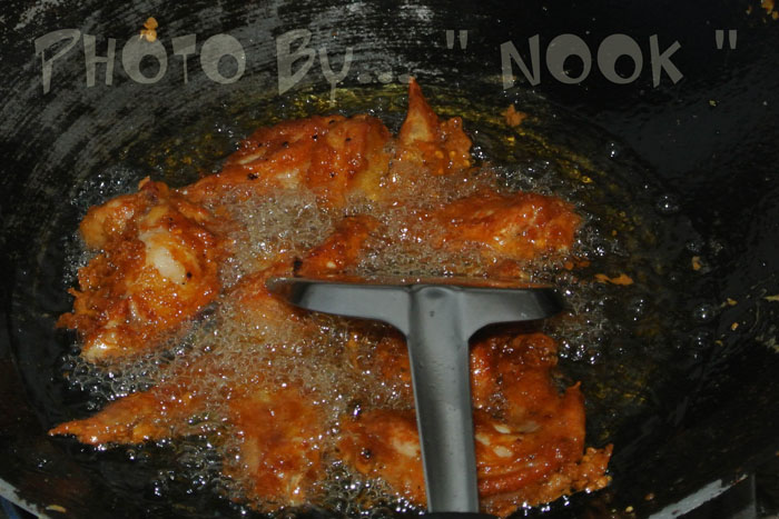 ตั้งน้ำมันให้ร้อน ใส่เนื้อไก่ลงไป พยายามพลิกกลับไปกลับมา จะได้สุกเสมอกัน