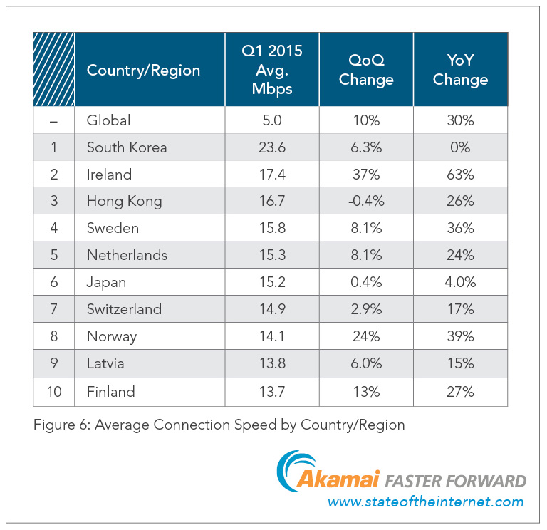 โดยประเทศเกาหลีใต้ (South Korea) ยังครองอันดับ 1 ในส่วนของ Broadband ที่ 23.6 Mbps