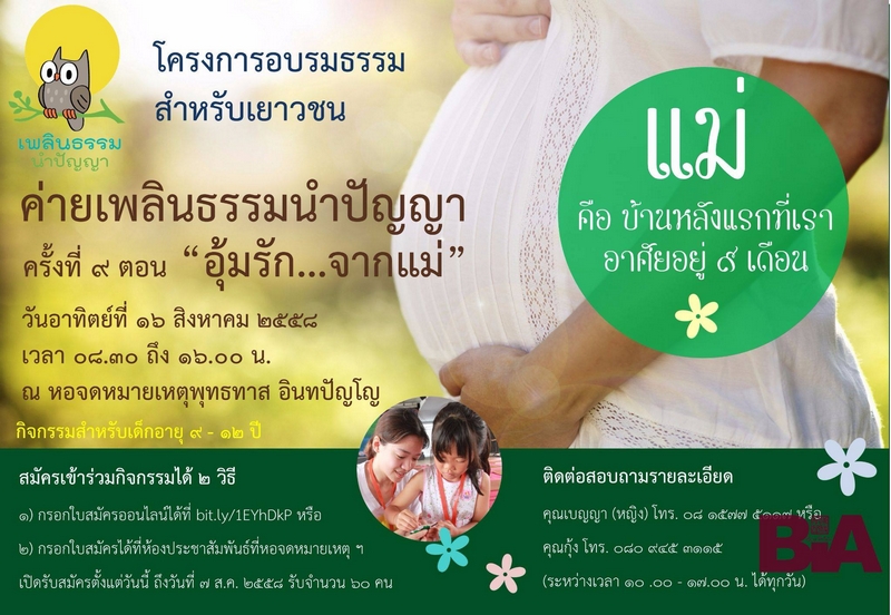 เชิญชวนร่วมกิจกรรม ค่ายเด็ก "เพลินธรรมนำปัญญา" ครั้งที่ ๔ ตอน "อุ้มรัก...จากแม่", อาทิตย์ที่ ๑๗ สิงหาคม ๒๕๕๗