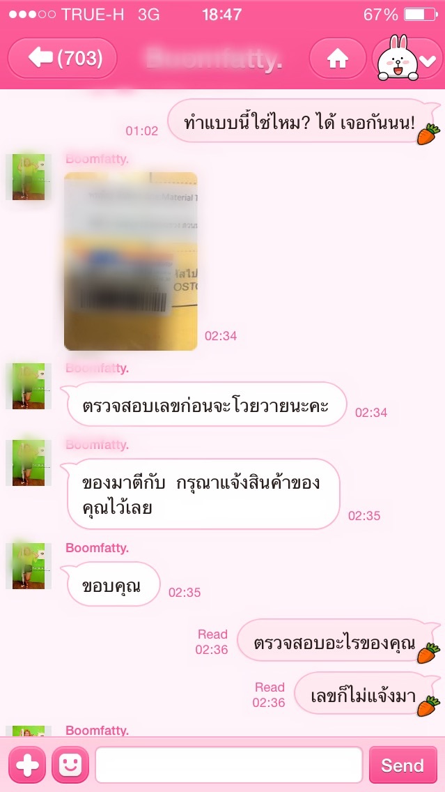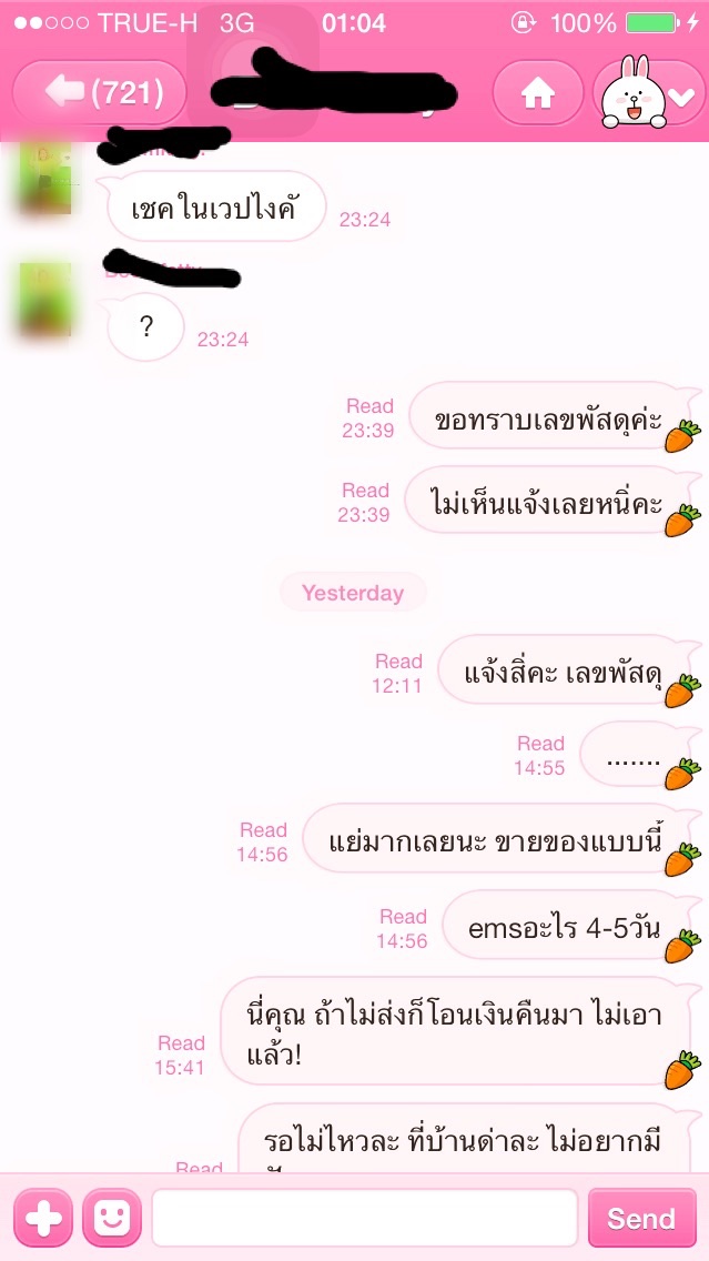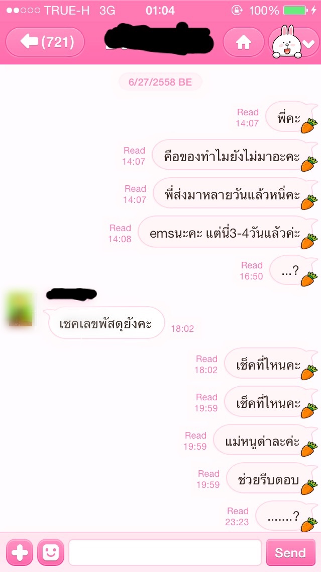 สวัสดีเพื่อนๆพี่ๆน้องๆทุกคนค่ะ ตอนนี้คือกำลังเดือดมาก เราสั่งซื้อกางเกงผ่านinternet ร้านนี้มีigเป็นหน้าร้านหลักๆค่ะ เราก็เข้าไปดูแล้วเตะตากางเกงตัวนึงก็รีบซื้อเลยค่ะเราก็สั่งแล้วโอนในวันต่อมาทันทีค่ะ เพราะกะจะใส่วันเสาร์ก็คำนวนทุกสิ่งอย่างไว้หมดแล้ว แต่แล้ว เรื่องที่เราไม่คิดว่าจะเกิดขึ้นกับเราโดยพฤติกรรมของแม่ค้าที่มีคนfollow instragram ถึง20k++ ก็เกิดขึ้นจนได้ คงต้องย้อนเล่าก่อนว่าเราโอนไปเย็นวันที่23สั่งแบบems ซึ่งทั้งชีวิตที่ซื้อของออนไลน์มาสั่งemsมาตลอดค่ะ ไม่ชอบรอนานๆที่ผ่านมาอย่างมากก็2วันค่ะไม่เคยเกินนี้. เราก็ได้มีการถามแม่ค้าในวันที่27 เพราะของไม่มีมาส่งค่ะ ปาเข้าไป3-4วันเข้าไปละ คำตอบที่ได้คือ เช็คเลขพัสดุยังคะ? เราก็ถามเช็คที่ไหนคะ แม่ค้าก็ตอบว่าในเวปไงคะ(เดี๋ยวจะแคปไลน์มาเป็นภาพประกอบนะคะ).เล่าลำบากอ่านแคปดีกว่าเนอะ. ไปดูกันเลยค่ะ