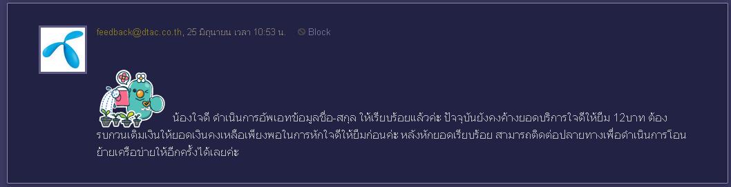 เมื่อ FB dtac ก็แจ้งว่า ดำเนินการอัพเอทข้อมูลชื่อ-สกุล ให้เรียบร้อยแล้ว เงินที่ค้างก็ไม่มีแล้ว จึงหลังไมค์ไปแจ้ง true อีกที