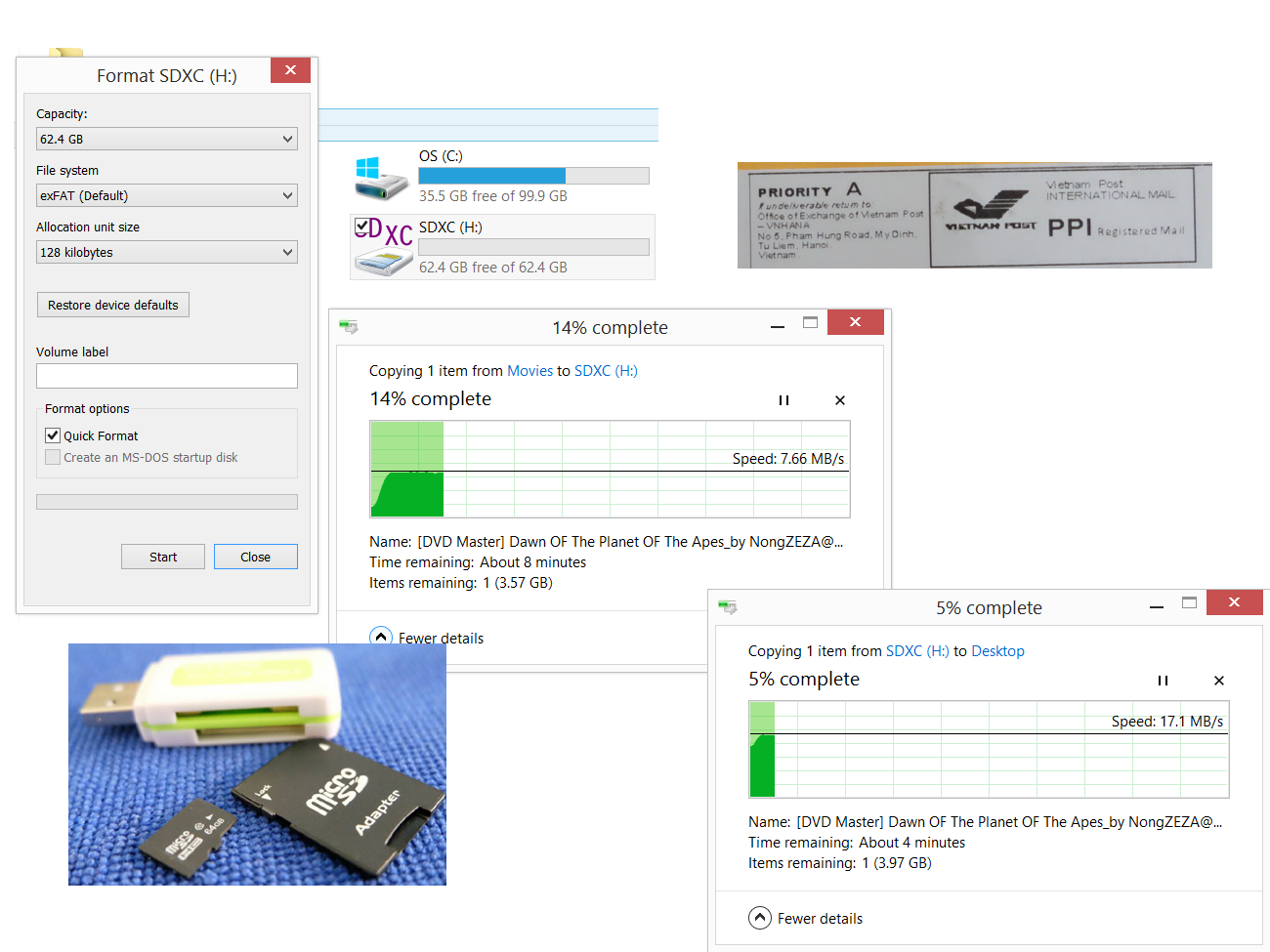 - สิ่งที่ได้มา MicroSD 64GB (เขาบอกว่า Class 10) + Adapter แปลงเป็น SD Card อันใหญ่ + Adapter แปลงจาก SD Card เสียบเป็น Flash drive ได้