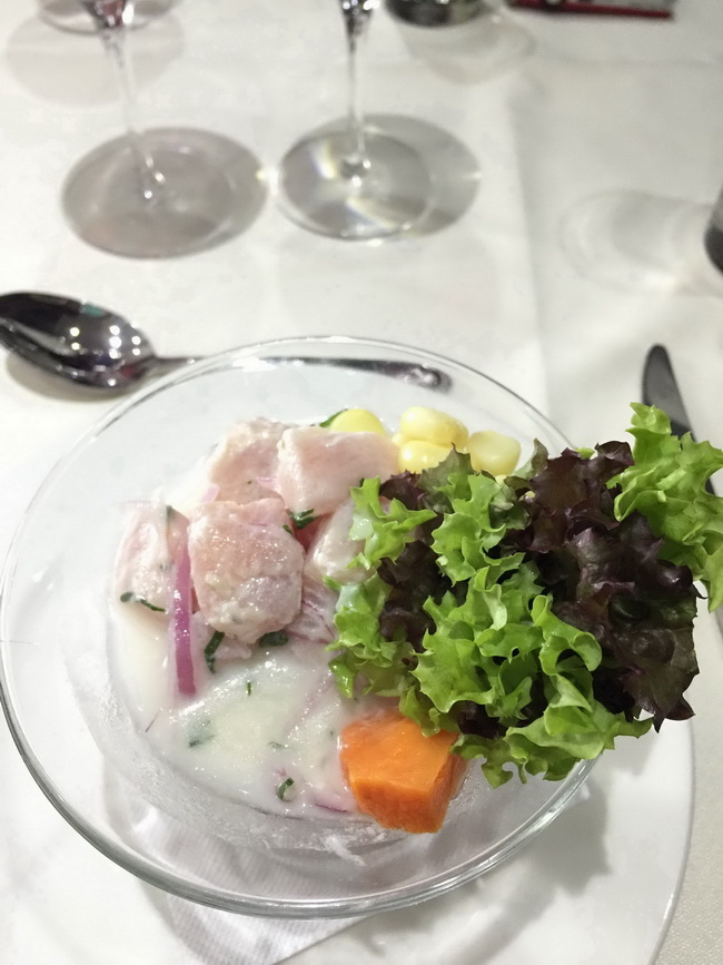 เซบิเช่ (Ceviche) อาหารขึ้นชื่อของชิลี (และของประเทศอื่นๆ ในแถบนี้อีกหลายประเทศ) เป็นยำปลาดิบ บีบมะนาวเปรี้ยวๆ ใส่หัวหอม ผักชี ข้าวโพดหวาน มันต้ม และผักสลัด อร่อยมากกก (หิวด้วยแหละ เป็นมื้อแรก)