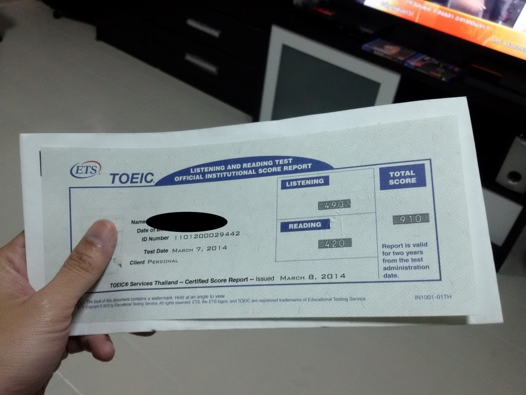 นั่นล่ะครับ สอบครั้งแรก ผมได้มา 910 คะแนน เท่าที่ทำไหวจริงๆ (ข้อสอบบ้านี่ก็เร็วเกิ๊น - -") แต่จริงๆ แค่ผ่านเกณฑ์ที่บ.ที่ตอนนั้นผมสมัครก็พอใจแล้ว เค้าขอแค่ 550 คะแนนเอง