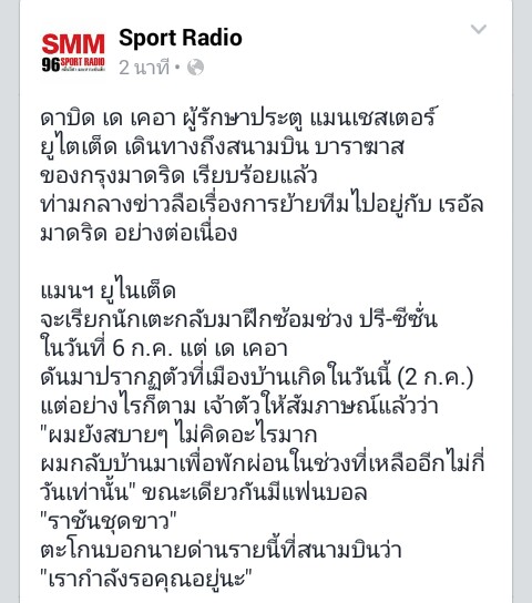 El Confidencial สื่อในสเปนรายงานสถานการณ์ล่าสุดว่าแมนเชสเตอร์ ยูไนเต็ดตอบรับข้อเสนอ 28.5 ล้านปอนด์ของเรอัล มาดริดยอมปล่อยดาบิด เด เกอามือกาวสแปนิชแล้ว มีรายงานว่าสุดยืนยันว่าตอนนี้มหากาพย์การย้ายสังก