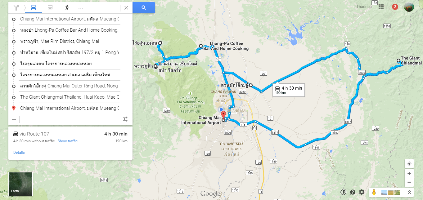 Day 1: ออกจากสนามบินเชียงใหม่ > กินเที่ยง "หลงป่า" > กินว่าง "พราวภูฟ้า" > กินเย็นและนอนพักผ่อน "ปานวิมาน"