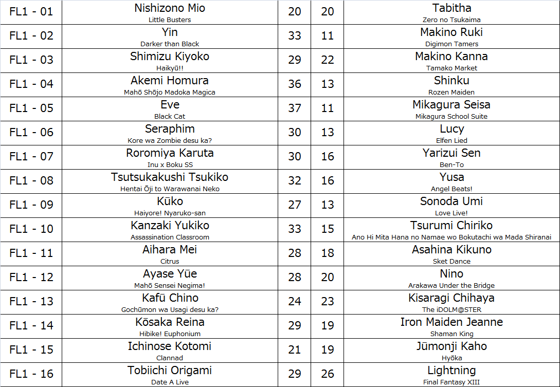 ในคู่ FL1-01 Nishisono Mio จาก Little Busters และ Tabitha จาก Zero no Tsukaima ได้คะแนนไป 20 คะแนนเท่ากัน จึงต้องต่อเวลาพิเศษออกไปอีก 1 วันครับ ในระหว่างนี้ก็สามารถโพสรูปเชียร์/เสนอรูปใหม่ได้เช่นเคย