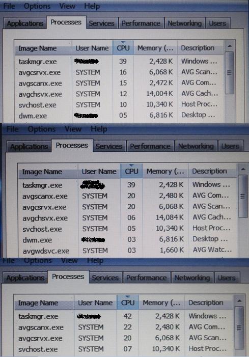 มี Task mgr / System Idel Process / svchost / dwm / agvcsrvx ทั้งหมด .exe วิ่งสลับไปมาๆ แต่ส่วนใหญ่จะเป็น Task mgr