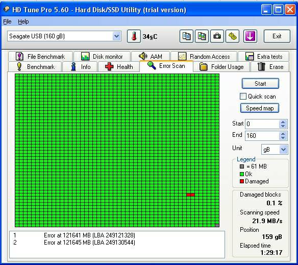 จาก HD Tune พบมี Bad sector 2 จุดติดๆ กัน ที่ 121.641 และ 121.645 GB (เกิดจาก power jack หลวม ทำให้ไฟดับบ่อยครั้งในช่วงหลัง)