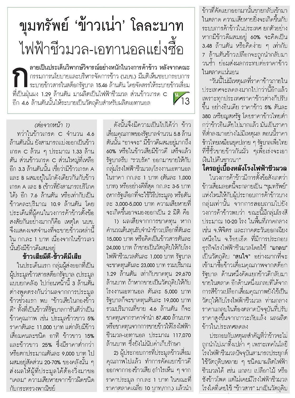 ขุมทรัพย์ 'ข้าวเน่า' กก.ละ 1 บาท / ไฟฟ้าชีวมวล-เอทานอล แย่งซื้อ