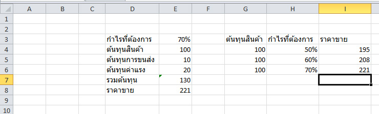 โดยมี 3 คอลัม คือ ต้นทุนสินค้า(G) กำไรที่ต้องการ(H) และราคาขาย(I)