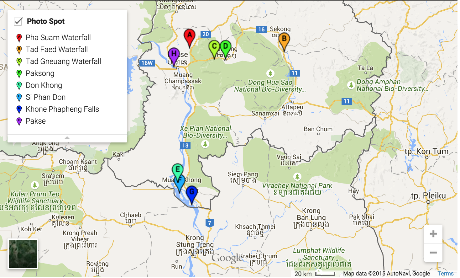 จากคำขวัญที่กล่าวไปข้างต้น ผมมีโอกาสได้ไปท่องเที่ยวและเยี่ยมชมสถานที่จากในคำขวัญเกือบหมด ขาดเพียงแค่ วัดพูที่ผมมีเวลาไม่พอ จึงขอติดไว้สำหรับทริปหน้าละกันนะครับ ส่วนทริปนี้ ผมขอเริ่มต้นด้วยแผนที่คร่าวๆทั้งหมด แผนที่ข้างล่างนี้จะเป็นที่ที่ผมได้ไปเยี่ยมชมและถ่ายรูปมา โดยทั้งหมดจะเรียงตามลำดับ ตามสถานที่ไว้เรียบร้อยแล้ว