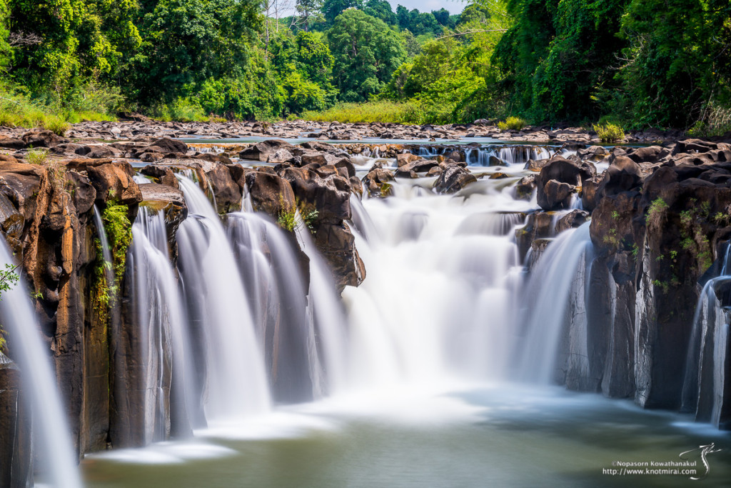 เดินทางไปยังเป้าหมายต่อไป น้ำตกตาดเยืองครับ น้ำตกแห่งนี้สามารถที่จะเดินเข้าไปใกล้ได้ ผมเลยหามุมถ่ายรูป โดยถ่ายจากบริเวณกลางน้ำ ซึ่งภาพที่ได้ออกมาก็คือภาพข้างล่างนี้เลยครับ บอกได้คำเดียวเลย ว่า เปียกเละเทะครับ ถ้าใครที่ถ่ายน้ำตกบ่อยๆ ก็น่าจะทราบอยู่แล้วนะครับ ว่าถ่ายระยะใกล้ขนาดนี้ ก็ต้องมีน้ำกระเซ็นเป็นธรรมดา เพราะฉะนั้นหากใครตั้งเป้าว่าจะถ่ายน้ำตกนี้ หรือถ่ายน้ำตกจากระยะใกล้ ให้เตรียมชุดที่สามารถลุยน้ำได้ และผ้าแห้งเพื่อใช้สำหรับเช็ดเลนส์และกล้องได้เลยครับ ๕๕๕