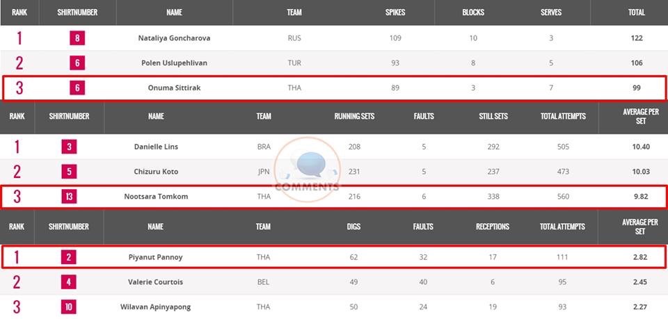 - ทำแต้มสูงสุด (จากสถิติ) *** อันดับ 1 อรอุมา สิทธิรักษ์ 100 แต้ม 90 ตบ 4 บล็อก 6 เสิร์ฟ - เสิร์ฟเอซสูงสุด (จากสถิติ) อันดับ 1 ซาโอริ คิมูระ 9 เอซ (ณ ขณะนี้) *** อันดับ 2 อรอุมา สิทธิรักษ์ 6 เอซ - ร