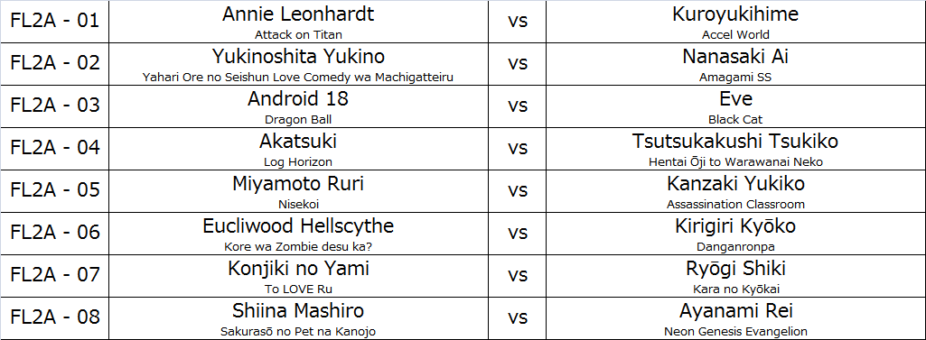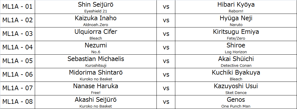(การประกบคู่ใช้วิธีสุ่มเลือกผู้แพ้จากสายบนมาพบกับผู้ชนะจากสายล่าง โดยไม่ให้ตัวละครที่เจอกันแล้วมาเจอกันอีกครับ)