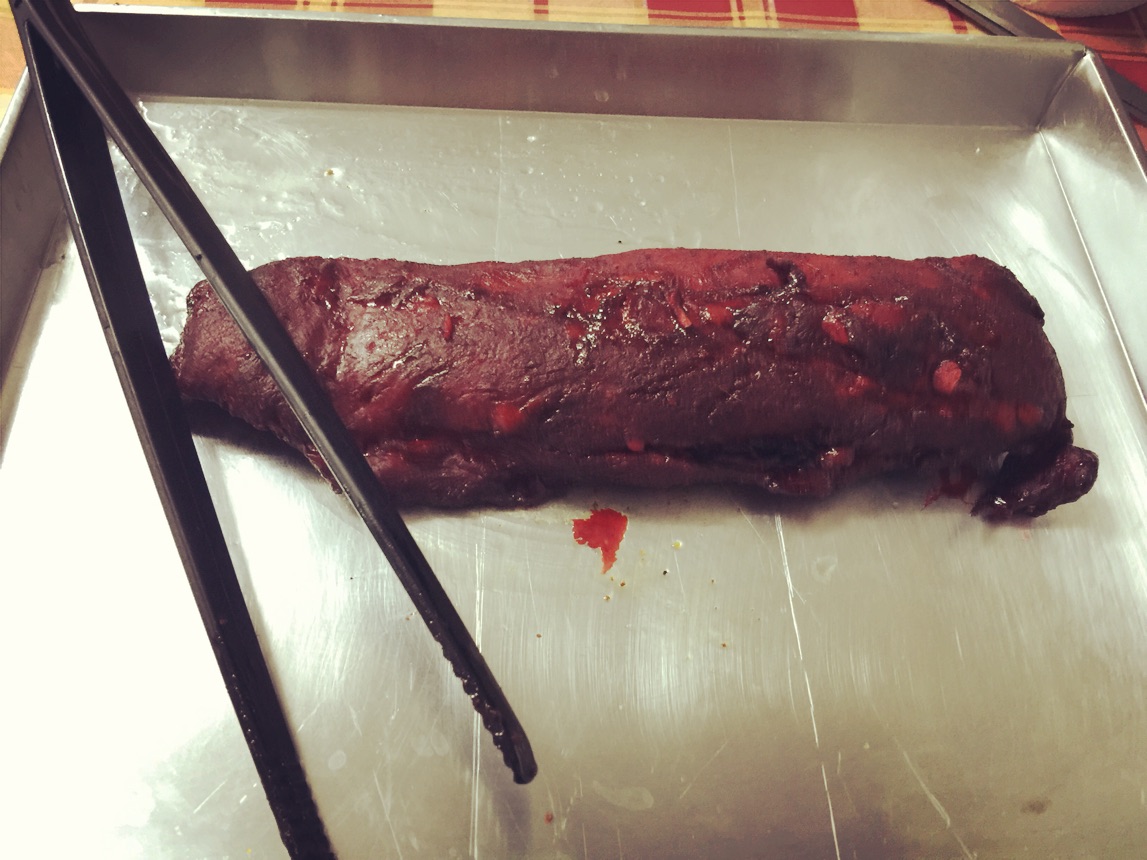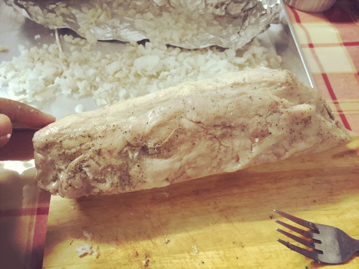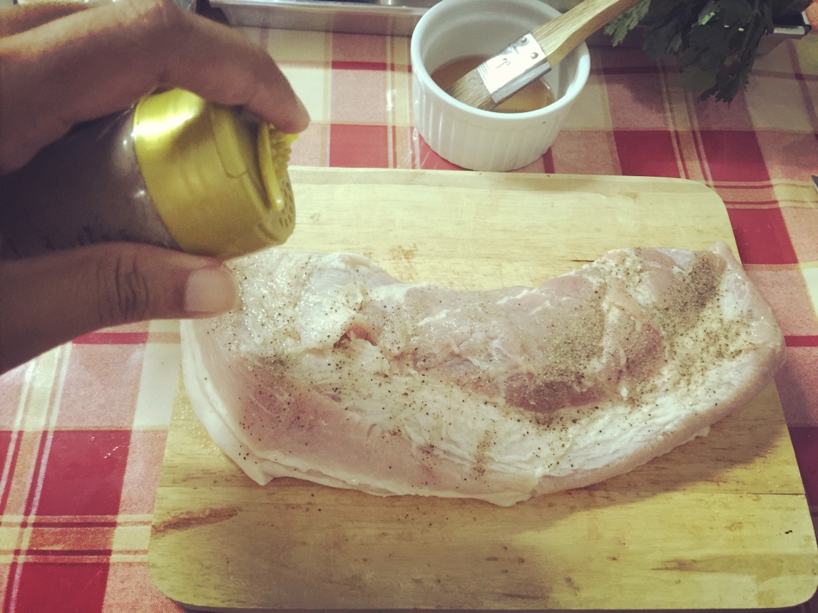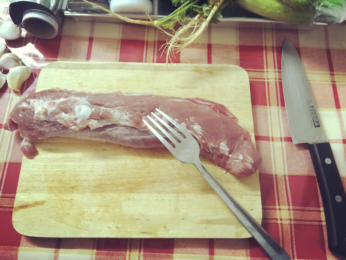 1. สันในหมูล้างให้สะอาดนะครับ แล้วใช้ทิชชูเช็ดให้แห้งครับ เสร็จแล้วก็เอาส้อมจิ้มๆ ให้ทั่วเลยเพื่อให้น้ำหมักซึมเข้าเนื้อครับ