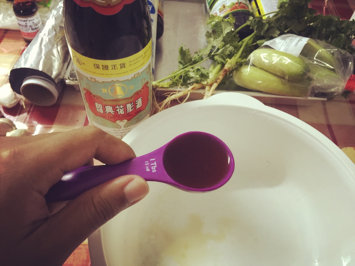 2. หาอ่างผสมมาสักใบนะครับ ใส่เหล้าจีนลงไป 2 ช้อนโต๊ะ