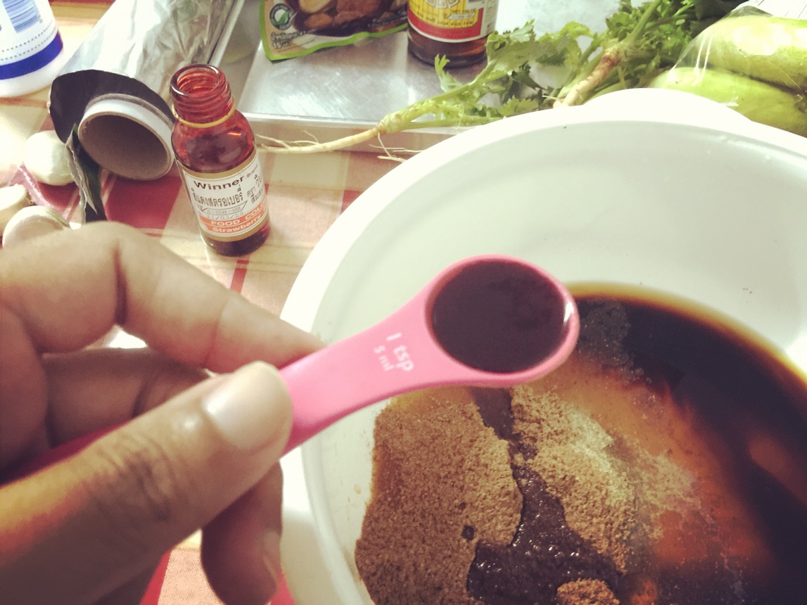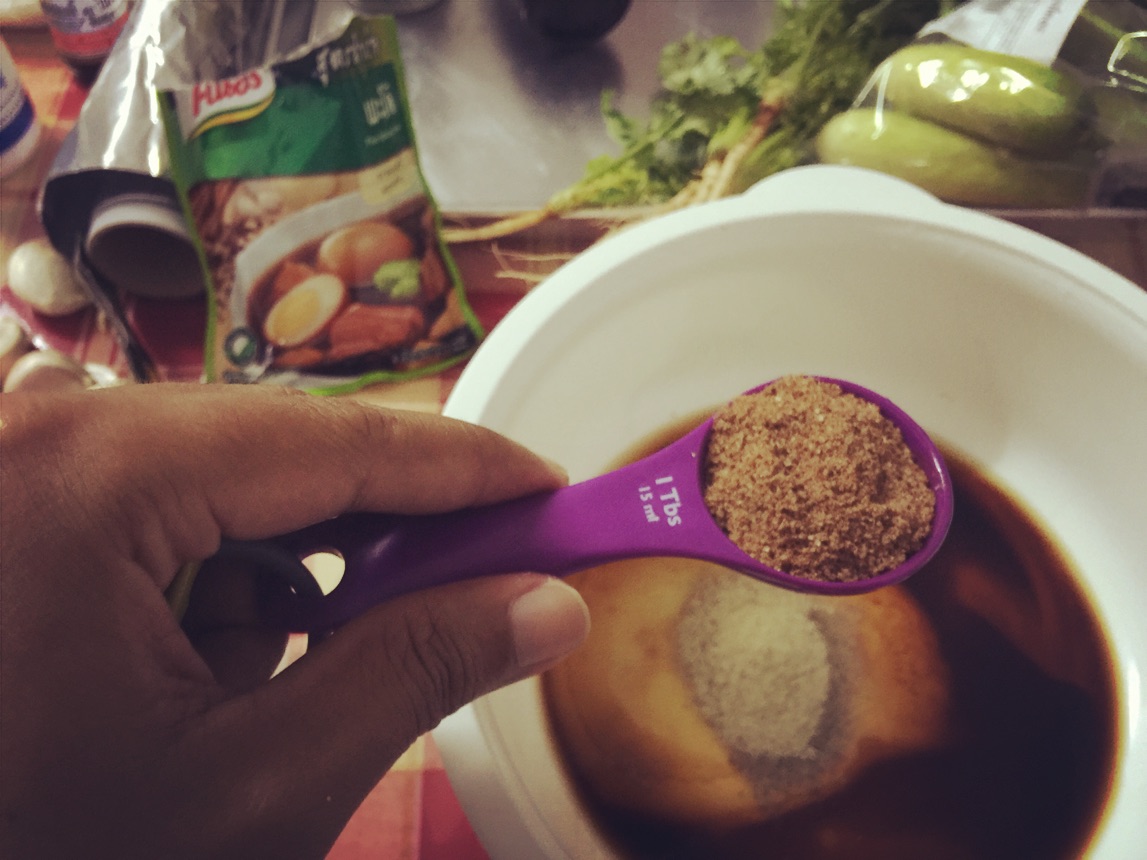 13. ปิดท้ายด้วยน้ำตาลทราย 1 ช้อนโต๊ะครับ ใส่ที่หลังเพราะน้ำตาลจะเกาะเนื้อหมู เวลาเอาไปอบจะไหม้ ทำให้สีสวย ไม่ใช่มีแต่สีแดงครับ