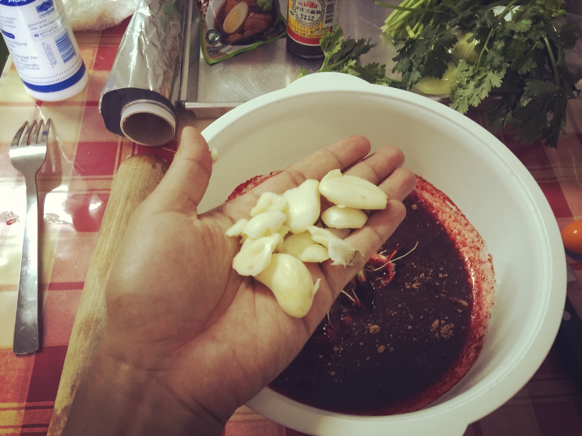 พอส่วนผสมเข้ากันก็เอาเจ้าสันในหมูโยนลงไป คลุกๆ ขยำขยี้ตามใจชอบ