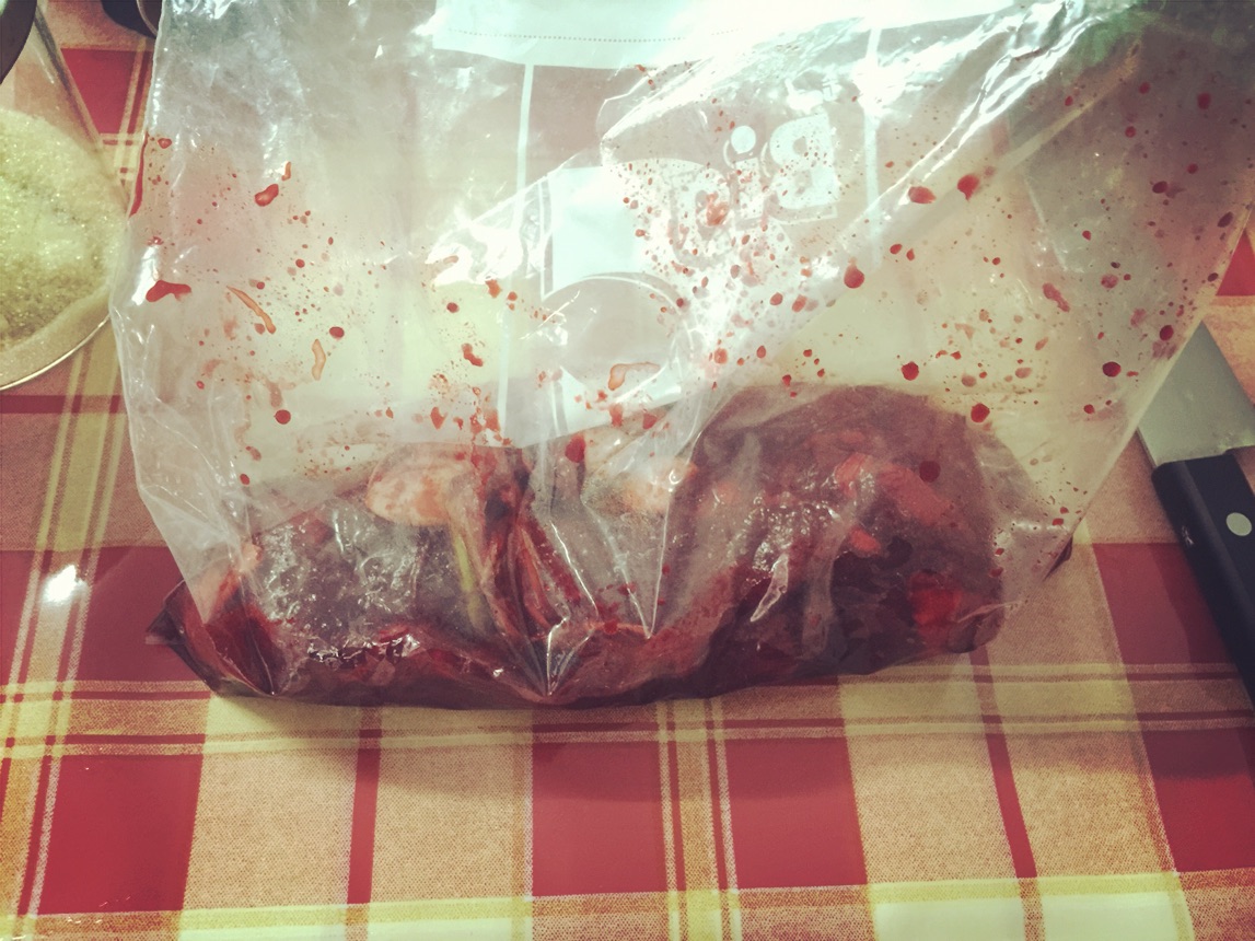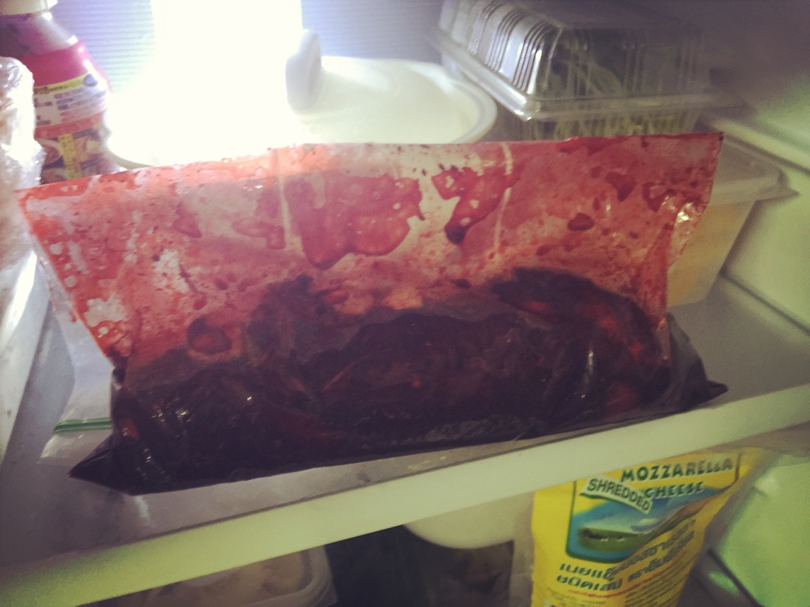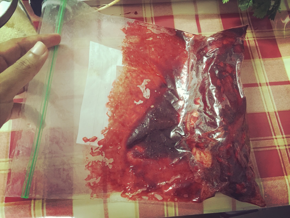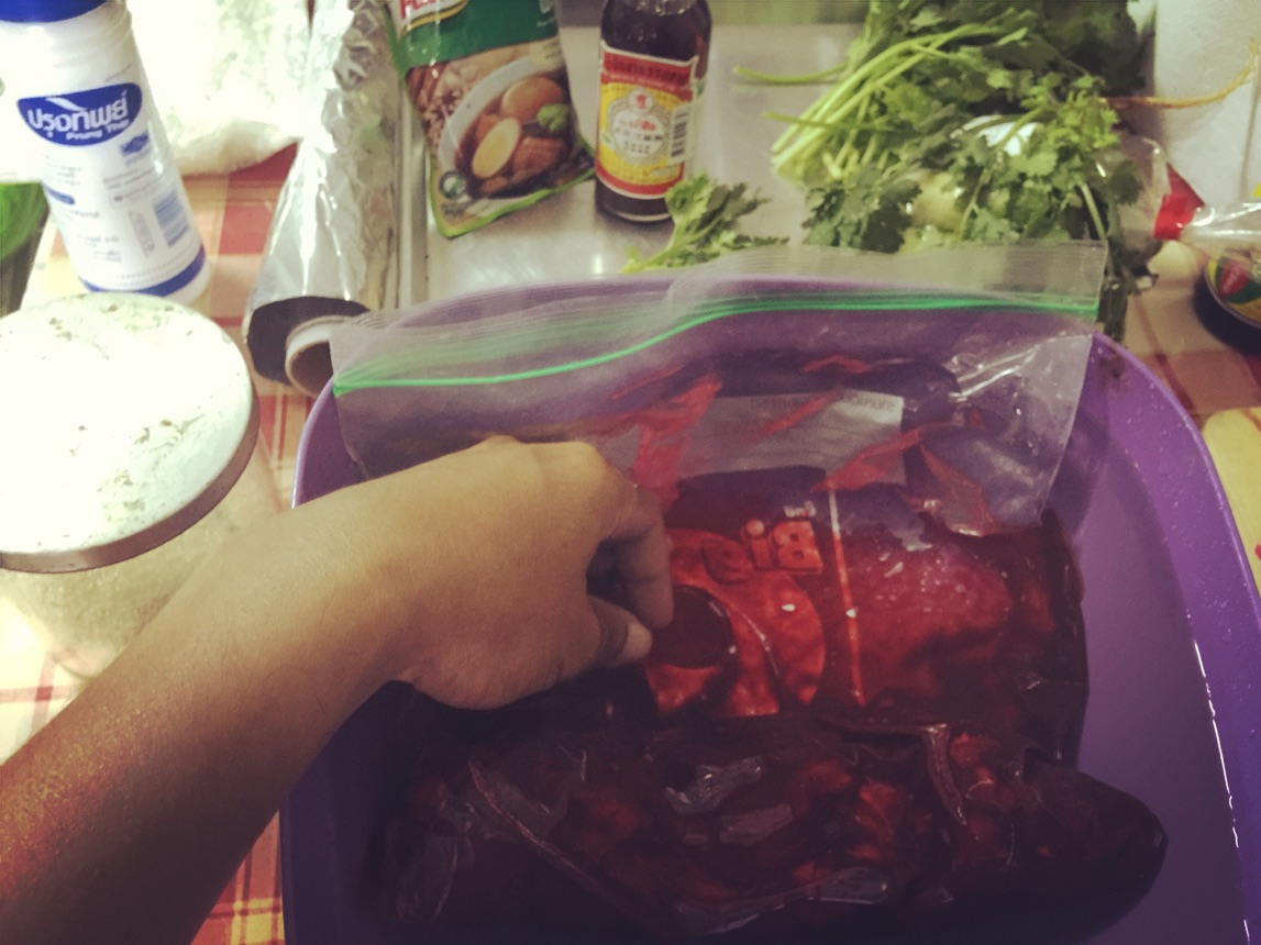 จากนั้นเอาหมูที่คลุกเรียบร้อยแล้วใส่ลงในถุงซิบล็อค (จับกดลงในน้ำเพื่อไล่อากาศออกนะครับ) แล้วเอาไปแช่เย็นช่องธรรมดา 2 ชั่วโมงนะครับ