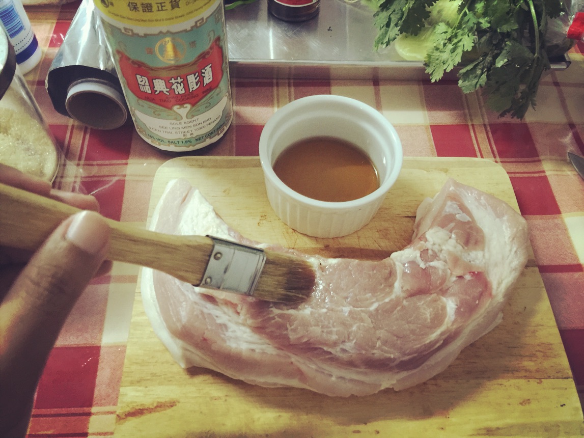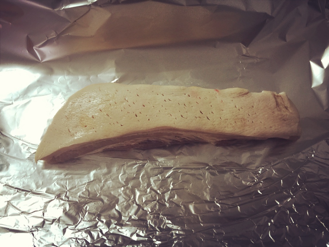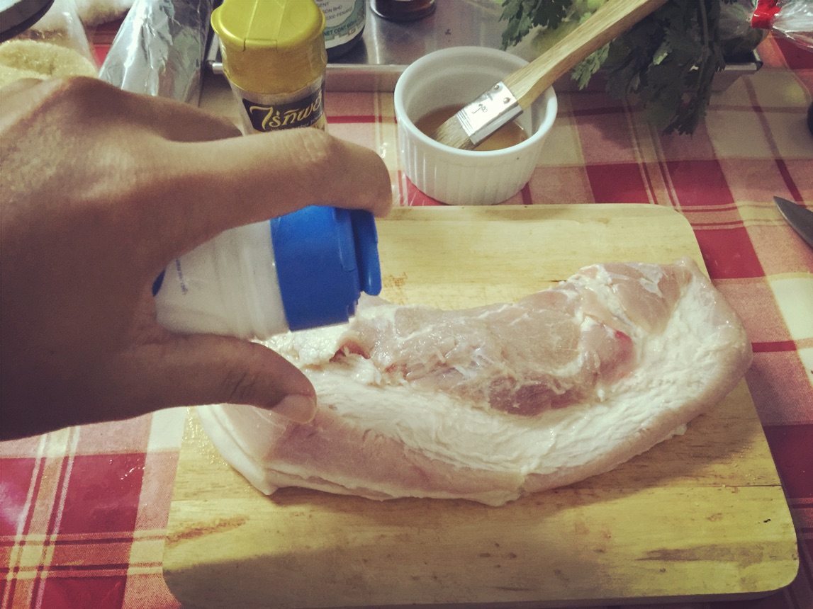 1. ล้างหมูสามชั้นให้สะอาด ซับให้แห้งครับ แล้วก็จิ้มๆหนังให้เป็นรูเยอะๆเลยครับ(ส้อมจิ้มไม่ไหวเหนียวเกิน ผมใช้มีดอันเล็กจิ้มแทนครับ)