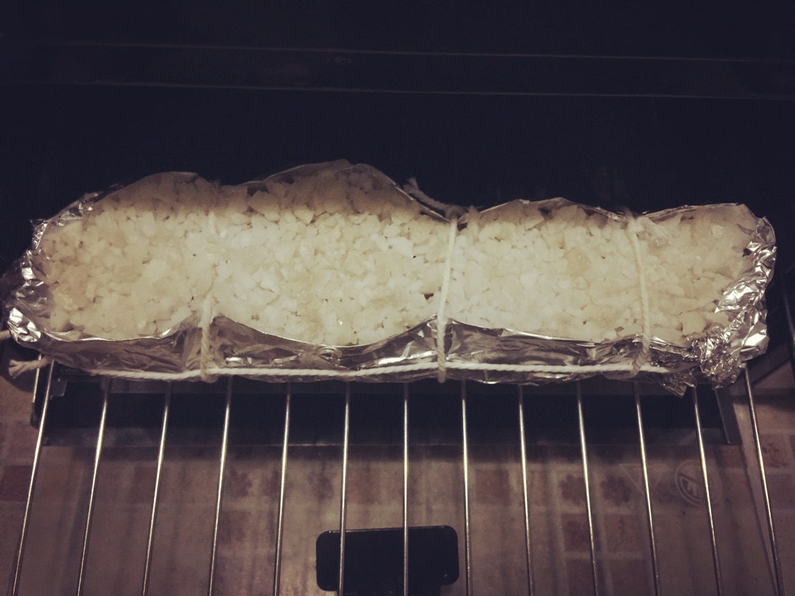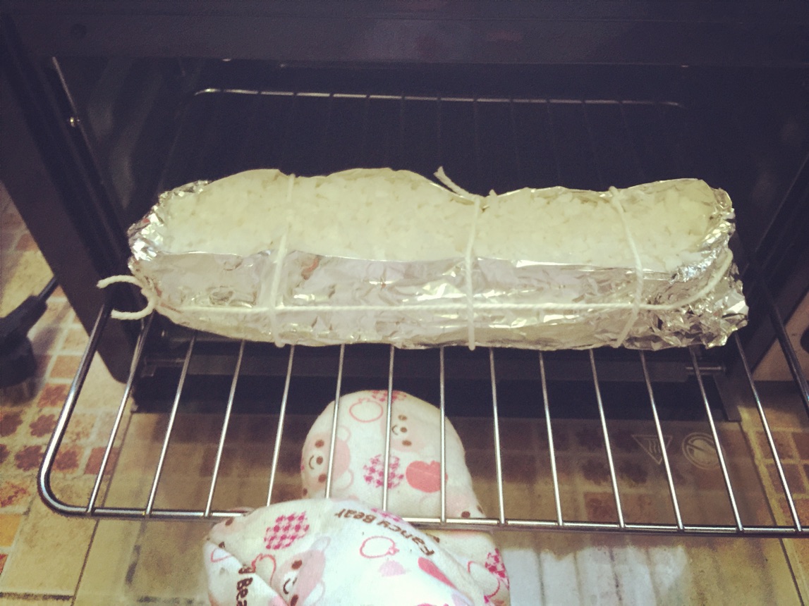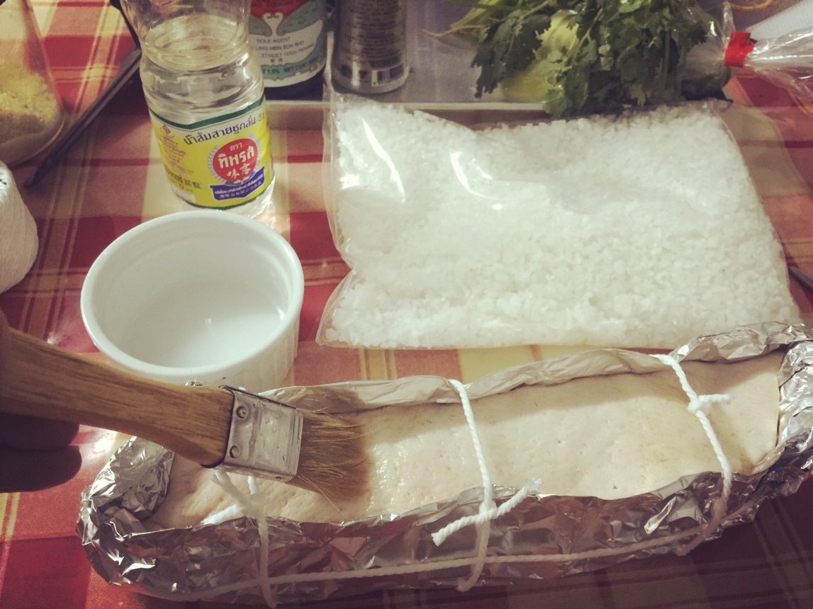 5. เสร็จจับนางคว่ำ แล้วนำอลูมิเนียมฟลอยมาห่อตามภาพเลยนะครับ ผมใช้เชือกผูกด้วยเพราะเวลาอบ หมูจะมีการขยายและหดตัว เกลืออาจจะร่วงลงไปทำให้หมูด้านล่างเค็มครับ
