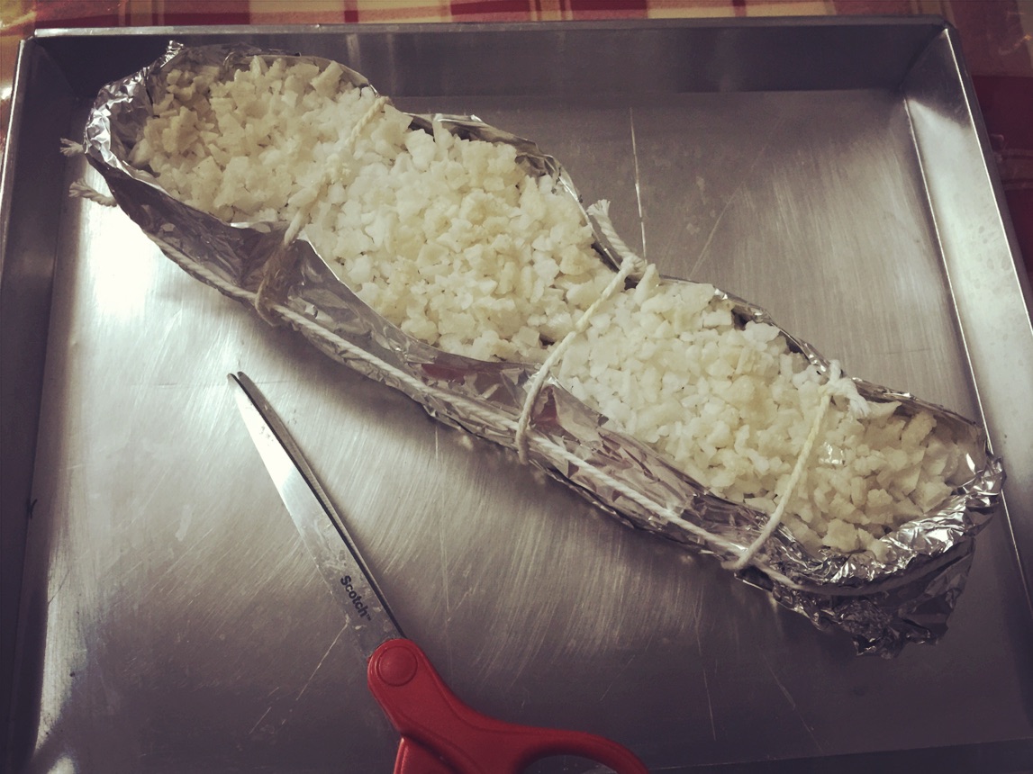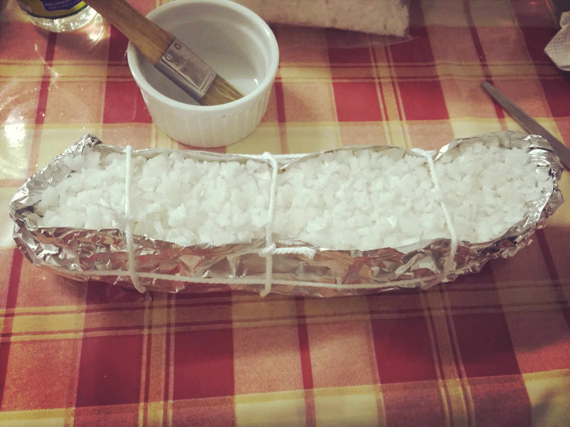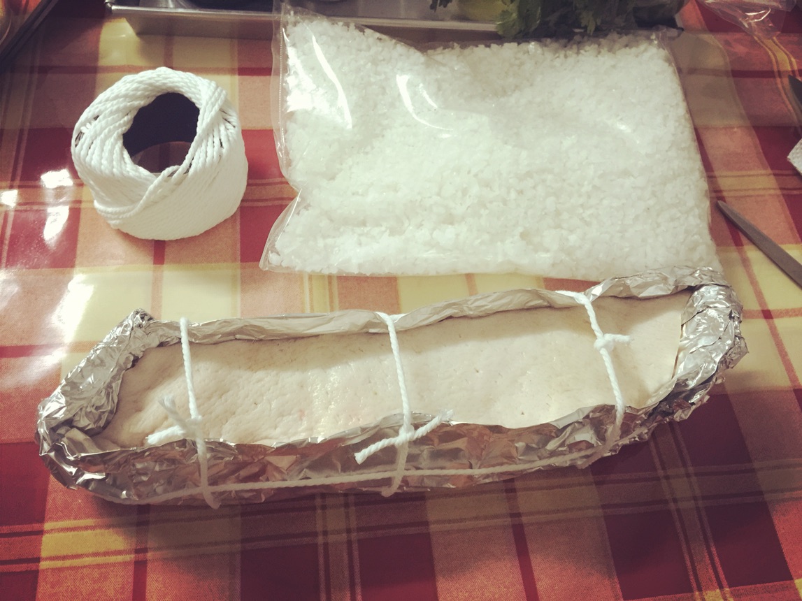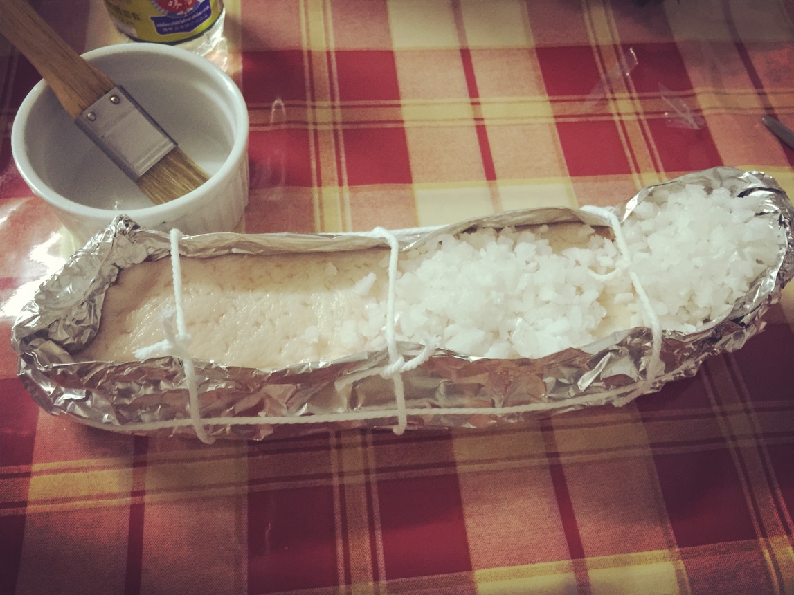 5. เสร็จจับนางคว่ำ แล้วนำอลูมิเนียมฟลอยมาห่อตามภาพเลยนะครับ ผมใช้เชือกผูกด้วยเพราะเวลาอบ หมูจะมีการขยายและหดตัว เกลืออาจจะร่วงลงไปทำให้หมูด้านล่างเค็มครับ