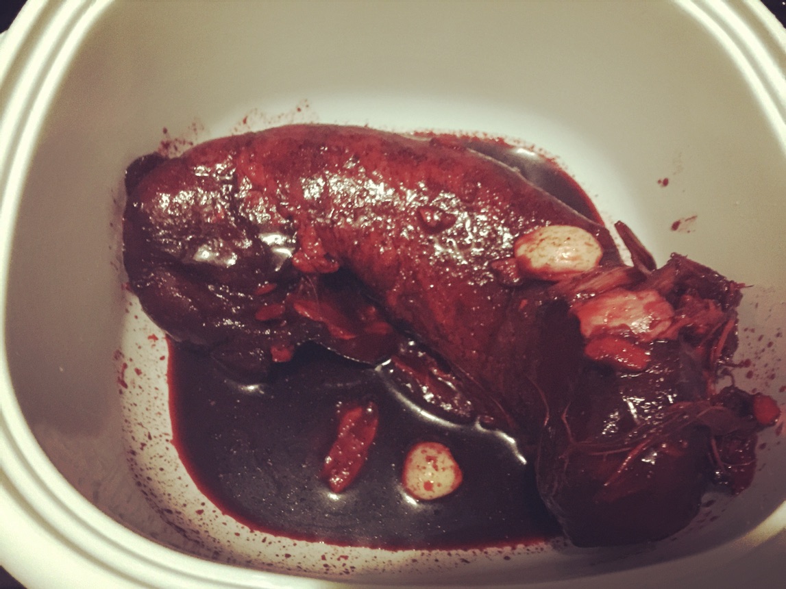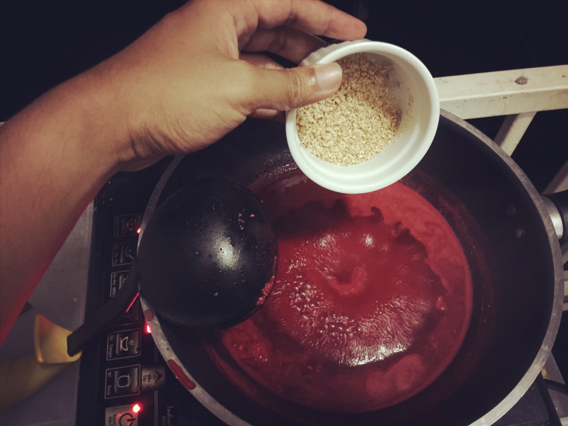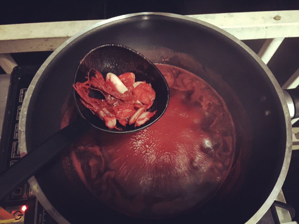 4. ใส่น้ำหมักหมูแดงลงไปครับ รอให้เดือด แล้วตักเครื่องหมักออก