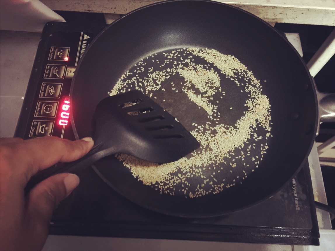5.ใส่น้ำย่างหมูแดง ถั่วลิสงคั่วบด งาขาวคั่วลงไปครับ