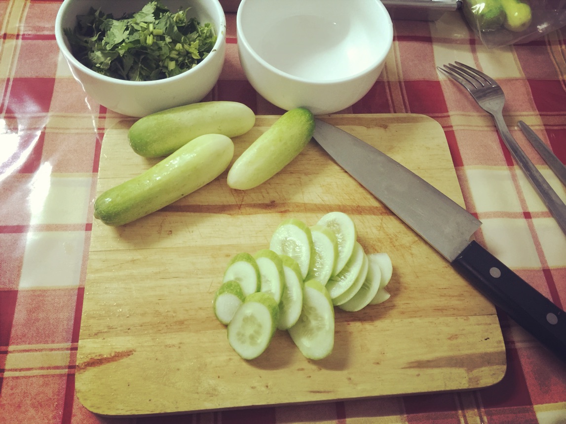 ต้นผักชีที่เราเอารากไปหมักหมูแล้ว เอามาซอยครับ แตงกวาด้วย