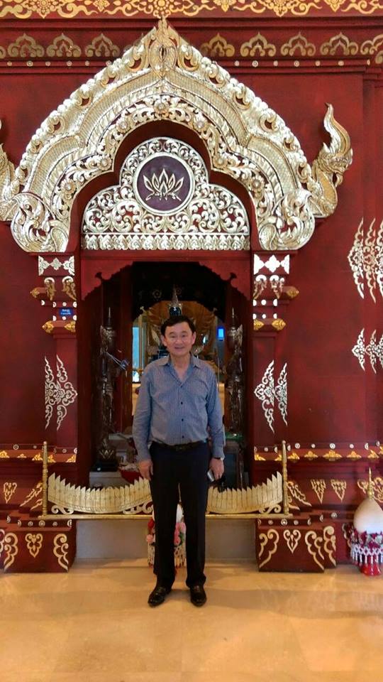 ได้โพสต์ข้อความผ่านเครือข่ายสังคมออนไลน์ โดยเป็นภาพถ่ายทักษิณ ยืนอยู่สถานที่แห่งหนึ่งที่มีการตกแต่งลวดลายอย่างสวยงาม คล้ายศาสนสถาน จำนวน 2 ภาพ พร้อมข้อความระบุว่า "ทายสิคะ อยู่ที่ไหน?"