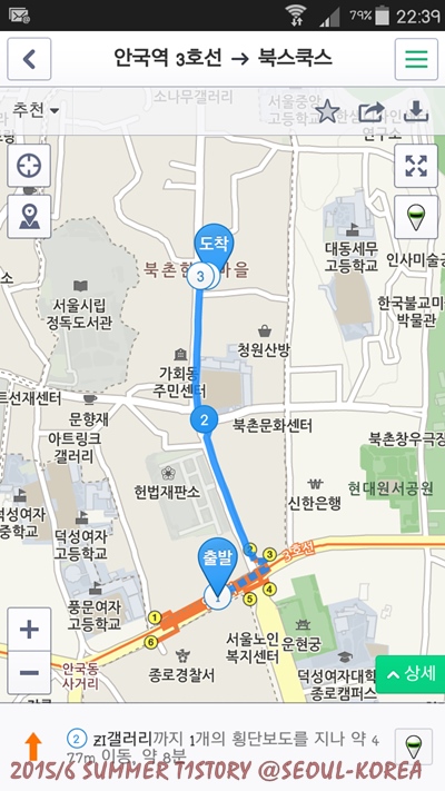 เดินไปตามทางเรื่อยๆ อ้างอิงจาก Naver map บอกว่า 477 เมตร 8 นาทีจากสถานี (นี่ว่าตีไป 500 เมตร 10 นาทีน่าจะใกล้เคียงความเป็นจริงมากกว่า) คอยมองทางขวามือไว้ก็เจอแล้วค่ะ ชื่อร้านจริงๆ ว่า 북스쿡스 / Books Cooks (ออกสำเนียงเกาหลีได้ว่า บุ๊ค-สึ-คุ๊ก-สึ)